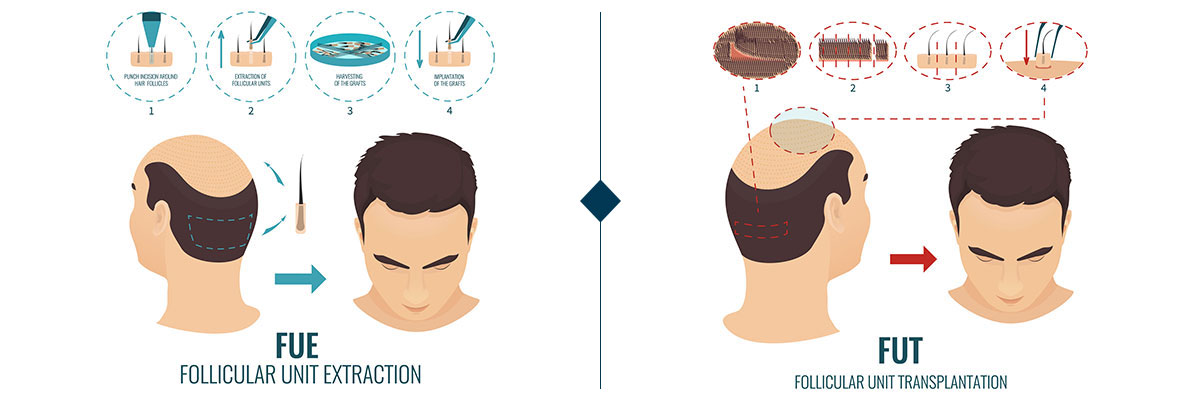 در روش FUT نوارهایی از موی پس سر برداشته میشه، بعدش زیر میکروسکوپ خرد میشه و به صورت واحدها یا فولیکوهای مو در میاد. بعدش پوست ناحیه طاس سر سوراخ میشه و اون موها در اون نواحی قرار میگیره. در روش FIT که نام دیگر آن FUE است، موها به صورت تکی و با روشی که بهش پانچ گفته میشه برداشته میشه.